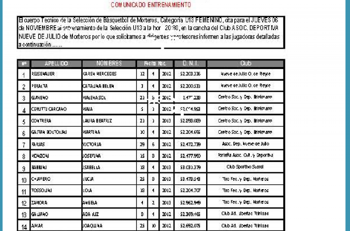 Novena Convocatoria a Entrenamientos Preselección U13 Femenina