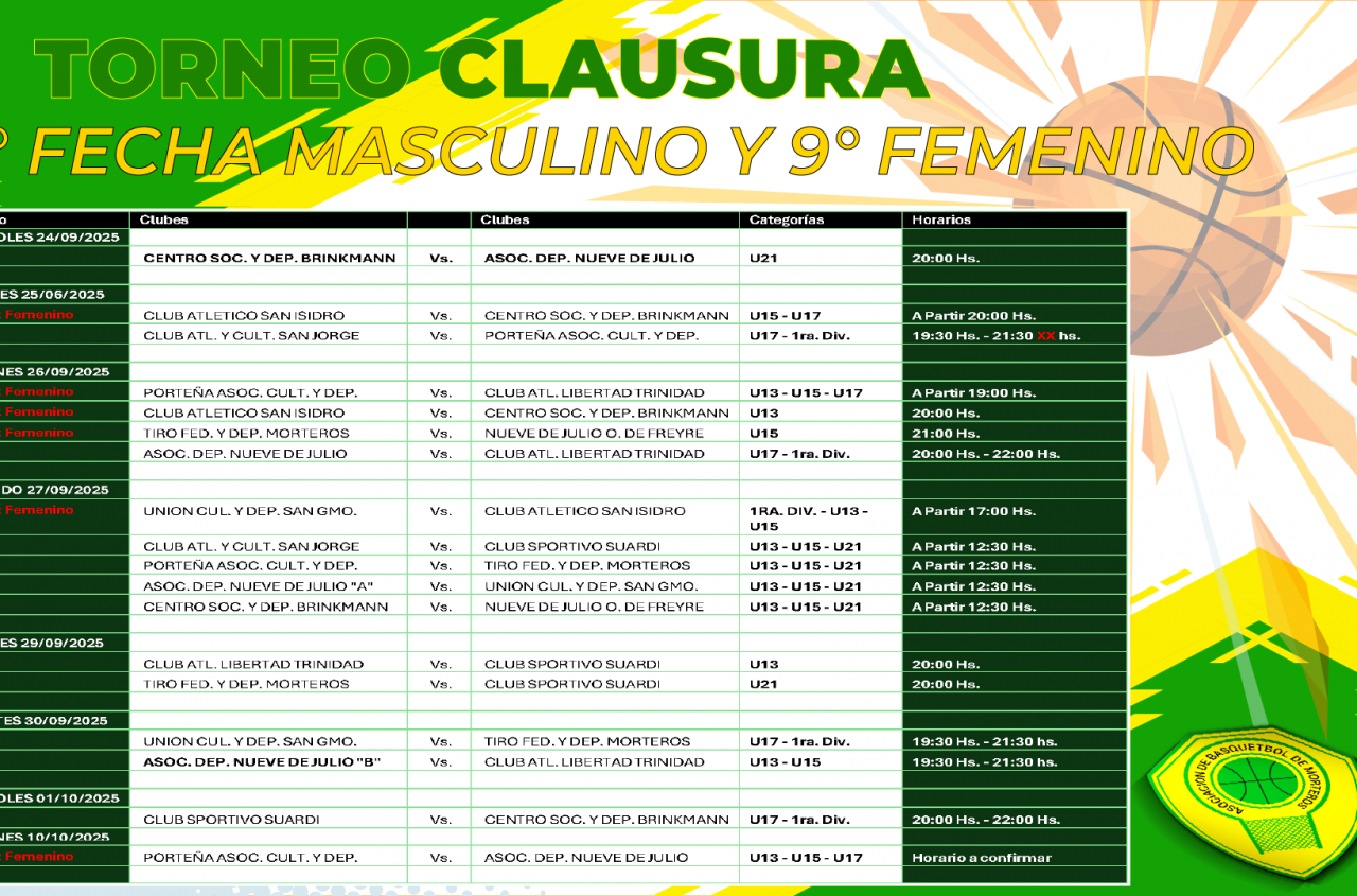 ⛹🏀Programación 10° Fecha del Torneo Clausura Masculino y 9° Fecha Femenino