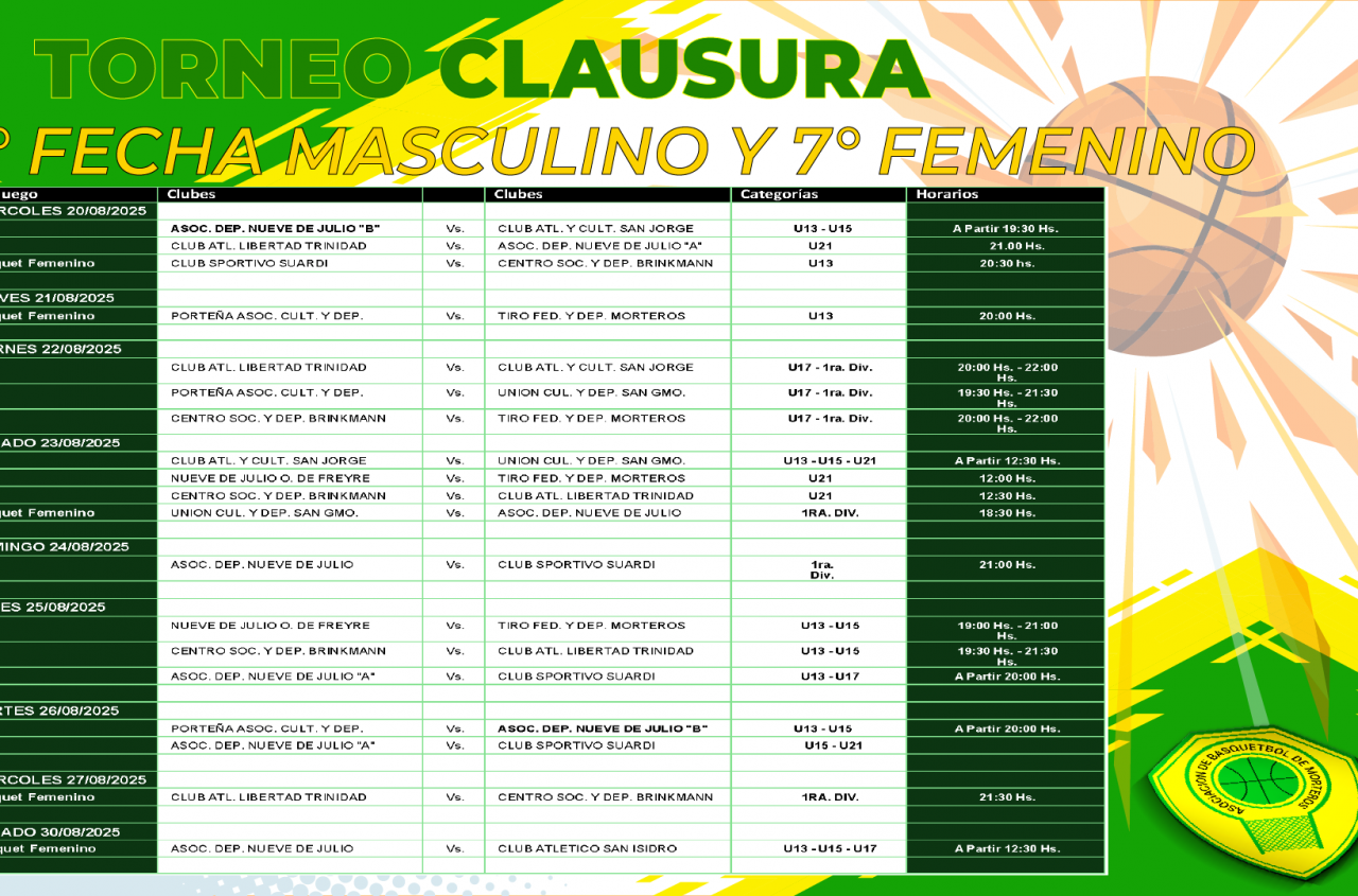 ⛹🏀Programación 8° Fecha del Torneo Clausura Masculino y 7° Fecha Femenino
