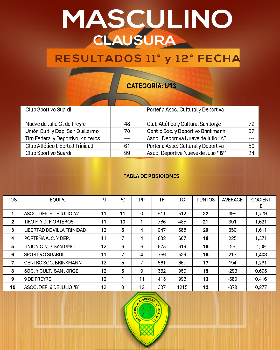 🏀Resultados y Tabla de Posiciones de la 11° y 12° Fecha del Torneo Clausura Masculino 2025 – Categoría U13