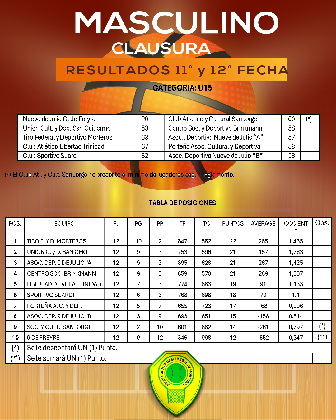 🏀Resultados y Tabla de Posiciones de la 11° y 12° Fecha del Torneo Clausura Masculino 2025 – Categoría U15