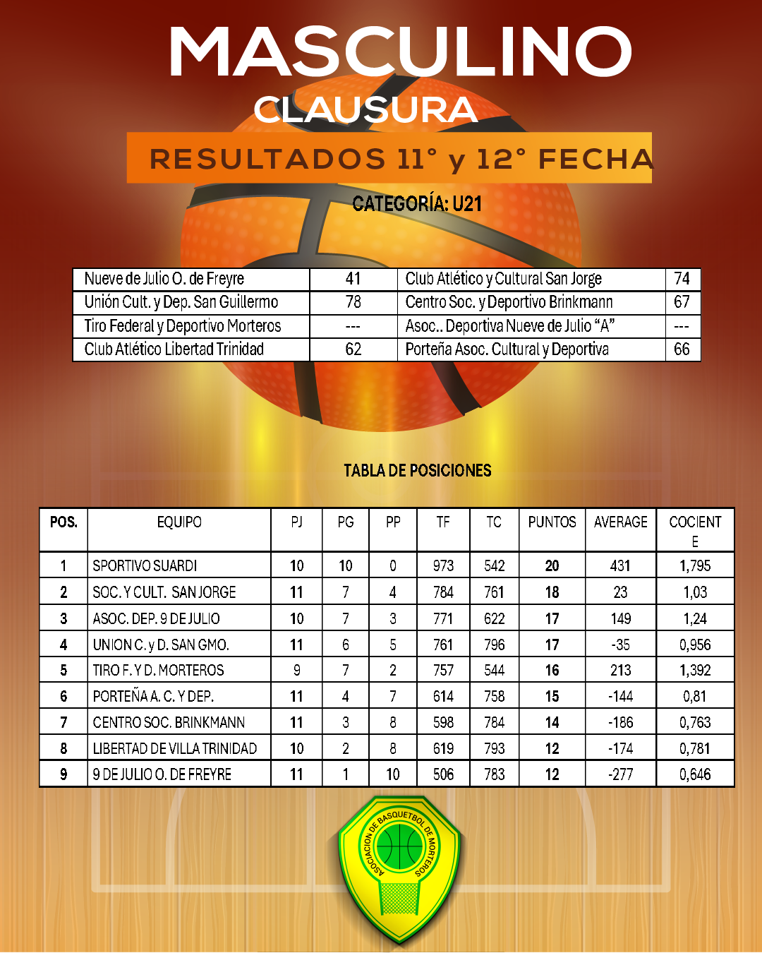 🏀Resultados y Tabla de Posiciones de la 11° y 12° Fecha del Torneo Clausura Masculino 2025 – Categoría U21