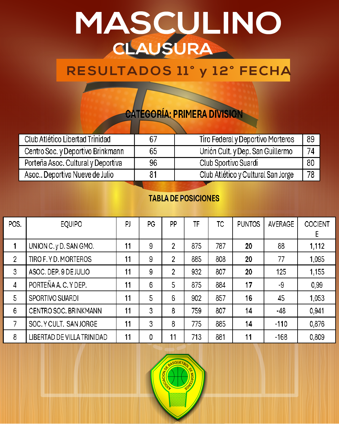 🏀Resultados y Tabla de Posiciones de la 11° y 12° Fecha del Torneo Clausura Masculino 2025 – Categoría Primera