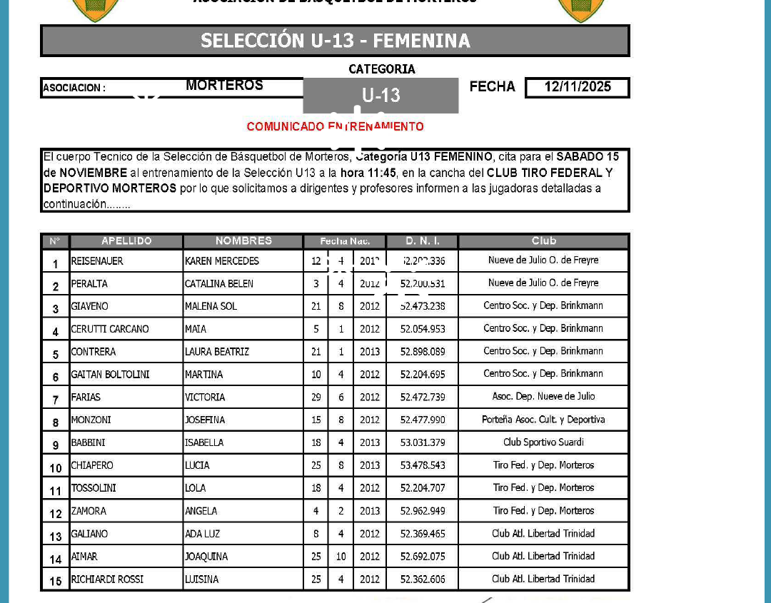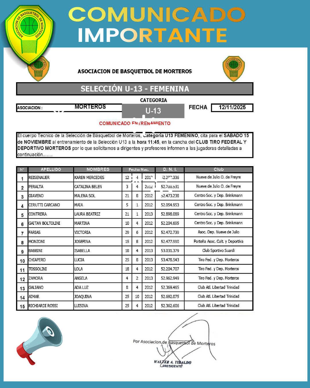 Décima Convocatoria a Entrenamientos Preselección U13 Femenina