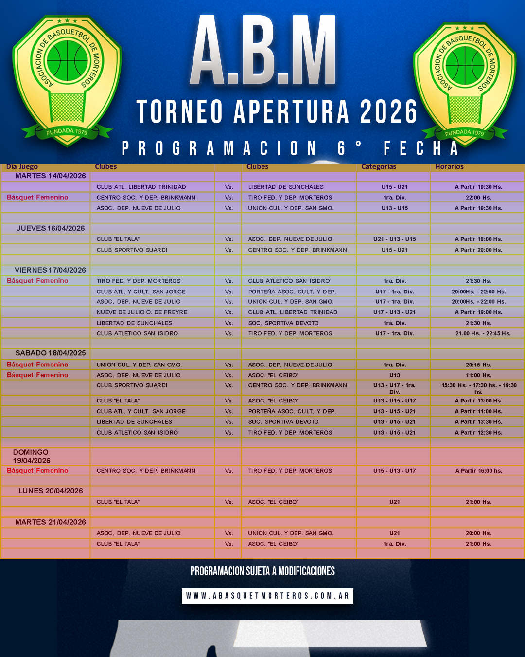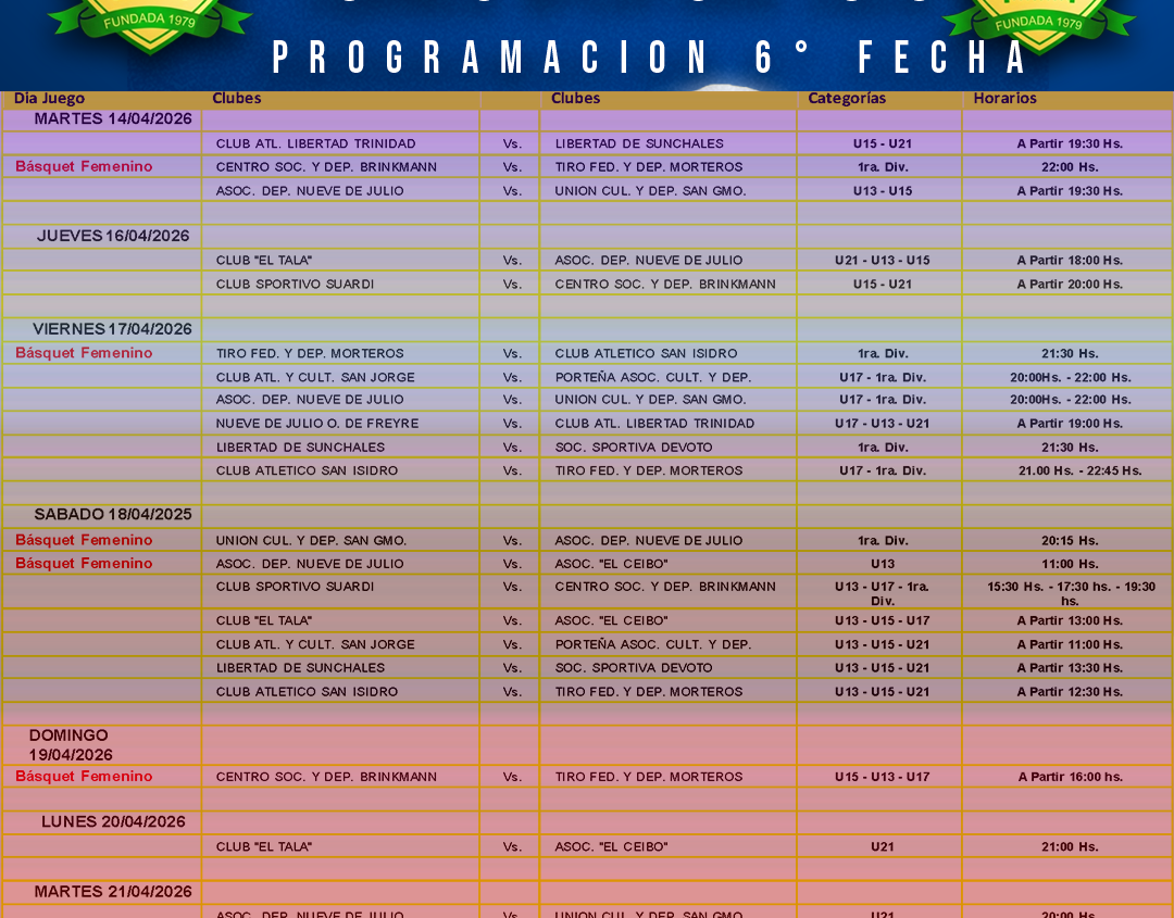 ⛹Programación Parcial Partidos 6° Fecha del Torneo Apertura Masculino 2026.🏆