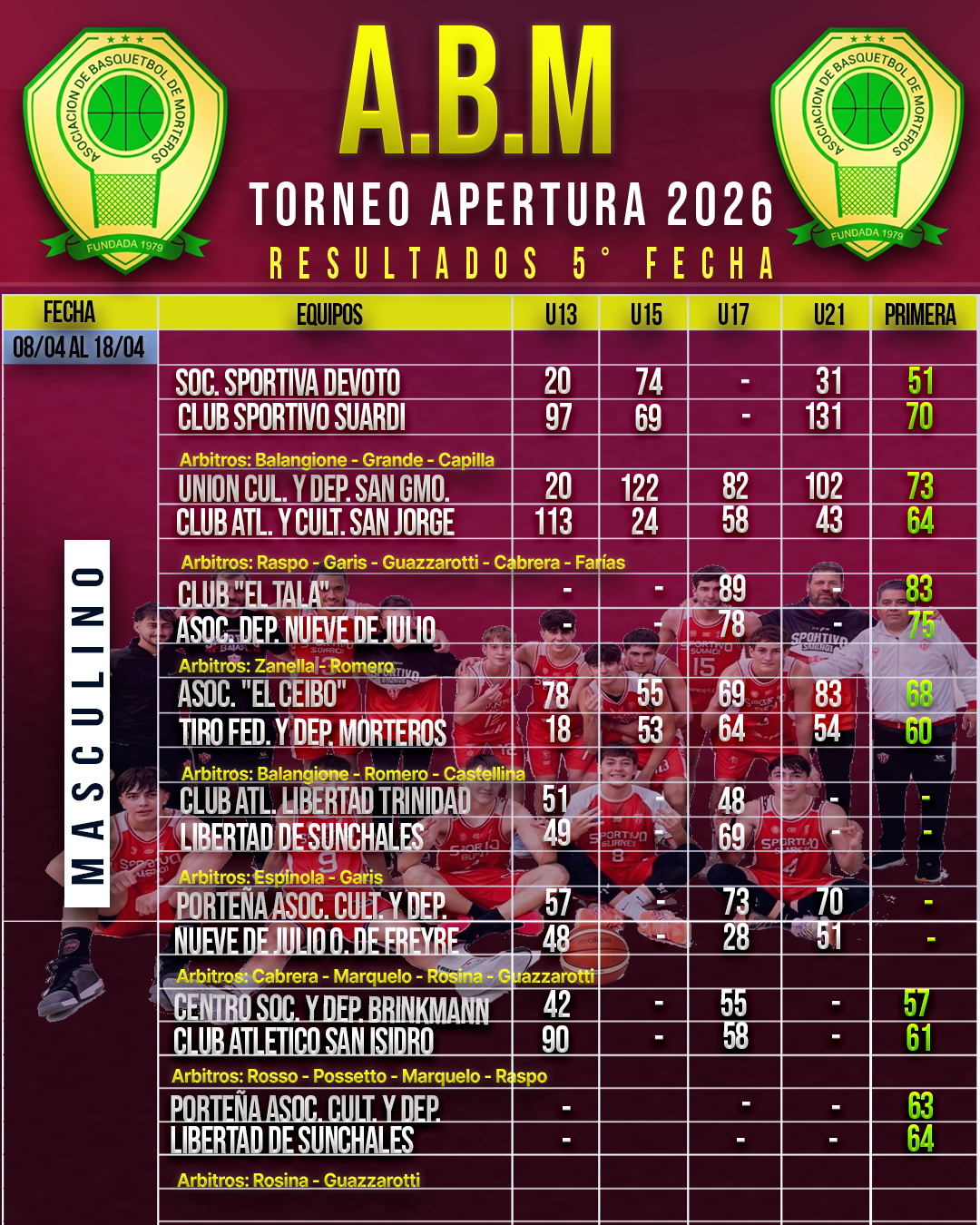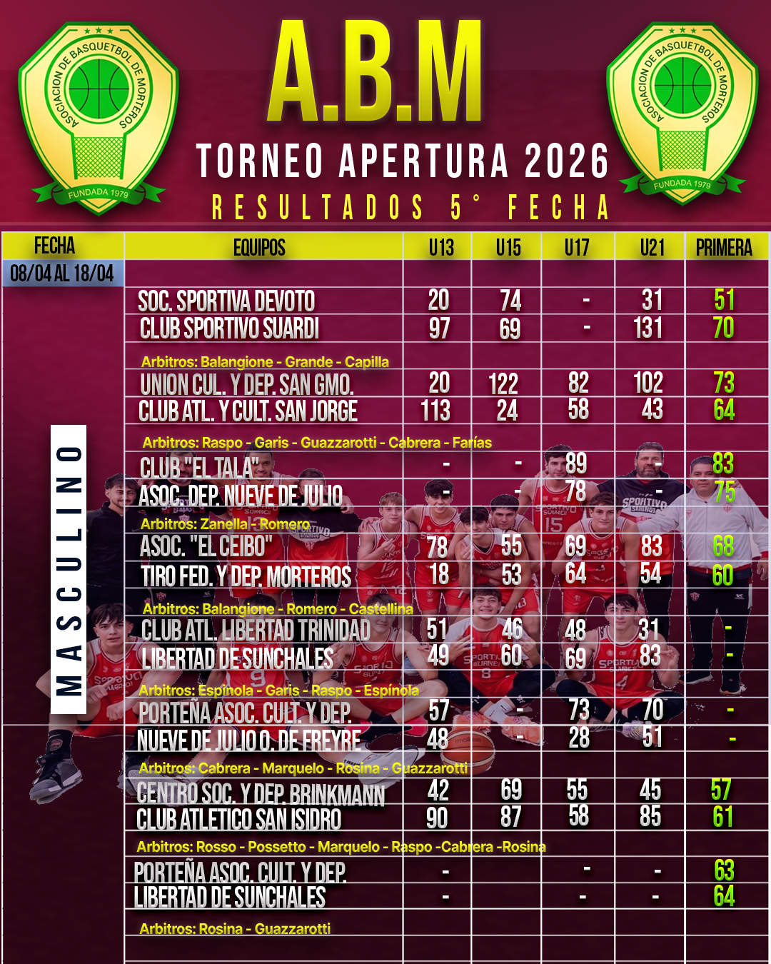 🏀🏆ACTUALIZADO❗👉 Resultados Parciales de la 5° Fecha del Torneo Apertura Asociativo Masculino.