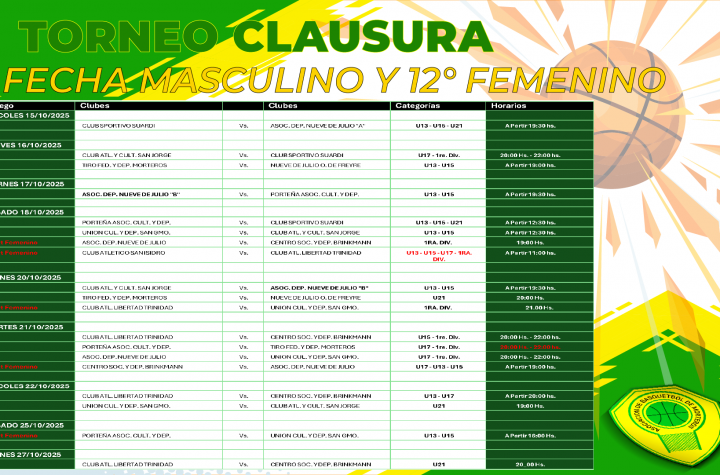 ⛹🏀Programación 11° Fecha del Torneo Clausura Masculino y 10° Fecha Femenino