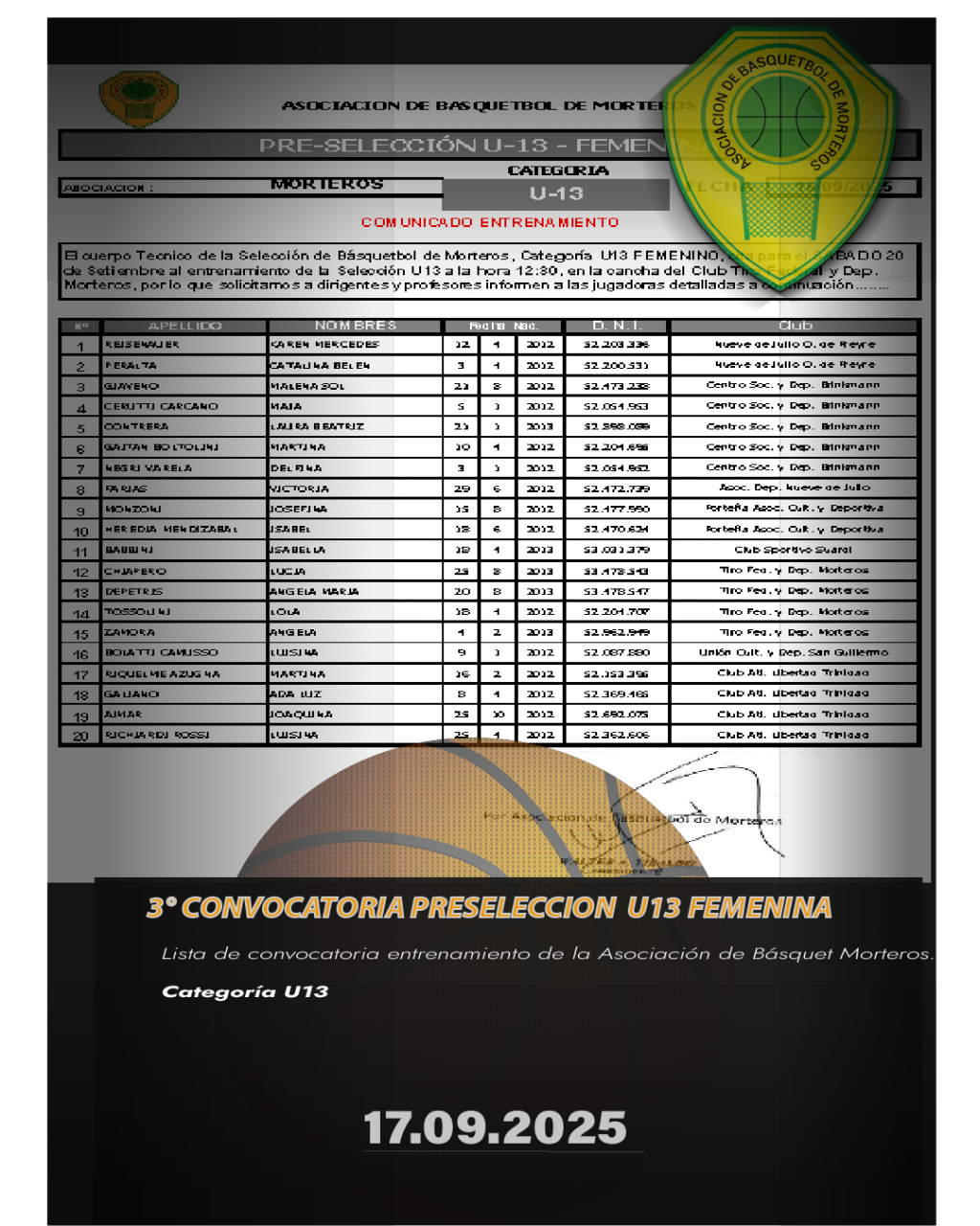 Octava Convocatoria a Entrenamientos Preselección U13 Femenina