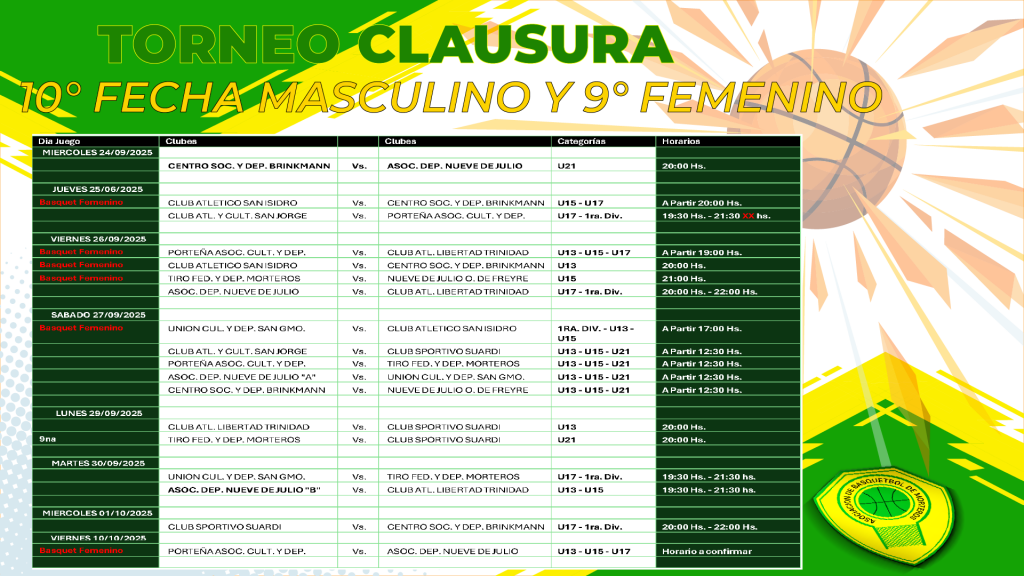 ⛹🏀Programación 10° Fecha del Torneo Clausura Masculino y 9° Fecha Femenino