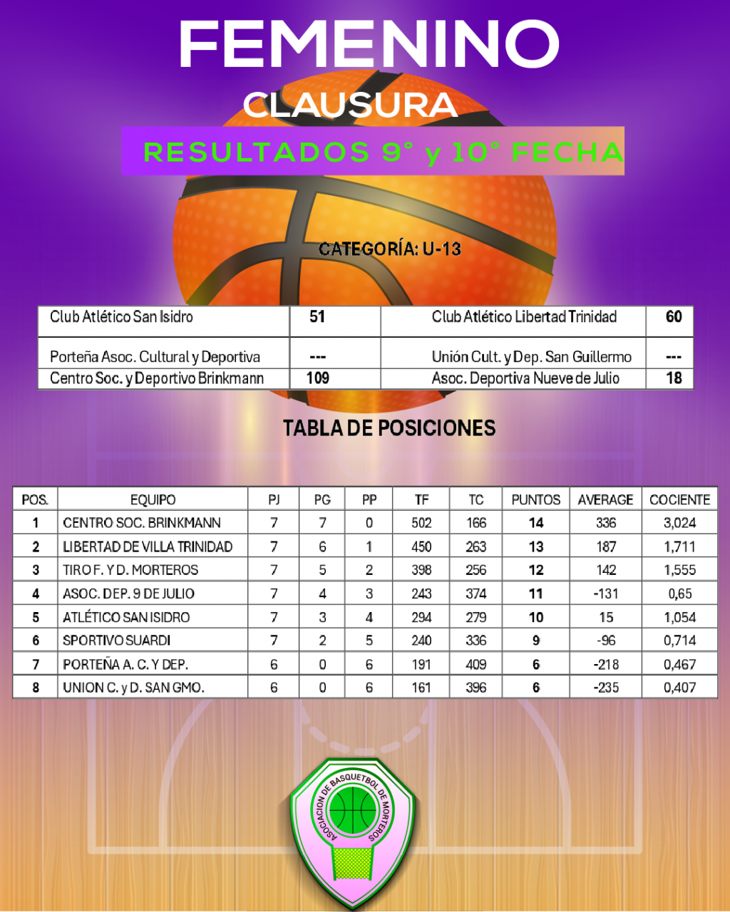 🏀Resultados y Tabla de Posiciones de la 9° y 10° Fecha del Torneo Clausura Femenino 2025 – Categoría U13