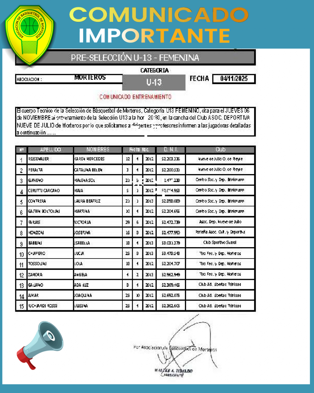 Novena Convocatoria a Entrenamientos Preselección U13 Femenina