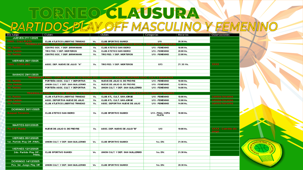 ⛹Programación Parcial Partidos Play Off Torneo Clausura Masculino y Femenino del 27/11 al 14/12