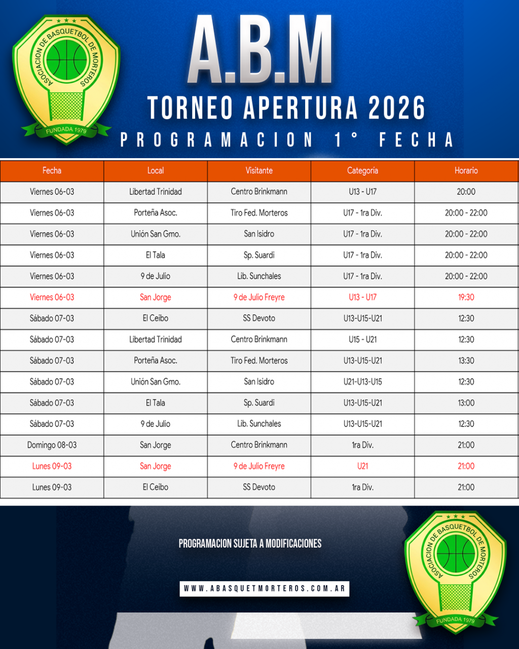 ⛹Programación Partidos 1° Fecha del Torneo Apertura Masculino 2026