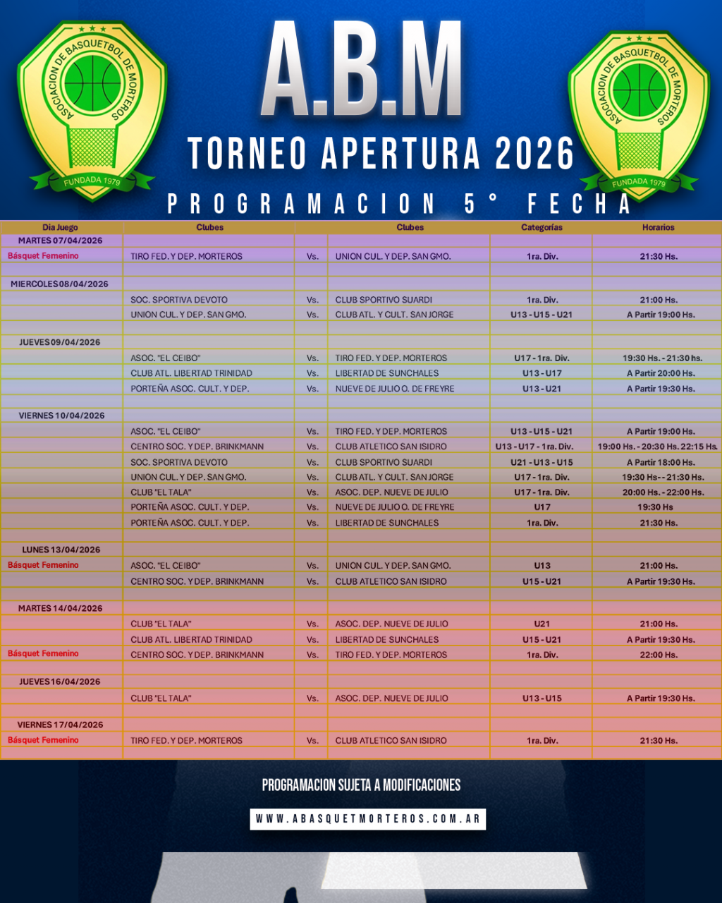 ⛹Programación Parcial Partidos 5° Fecha del Torneo Apertura Masculino 2026.🏆