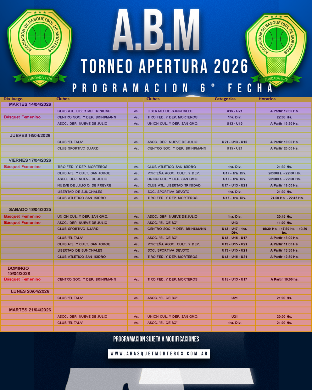 ⛹Programación Partidos 3° Fecha del Torneo Apertura Masculino 2026