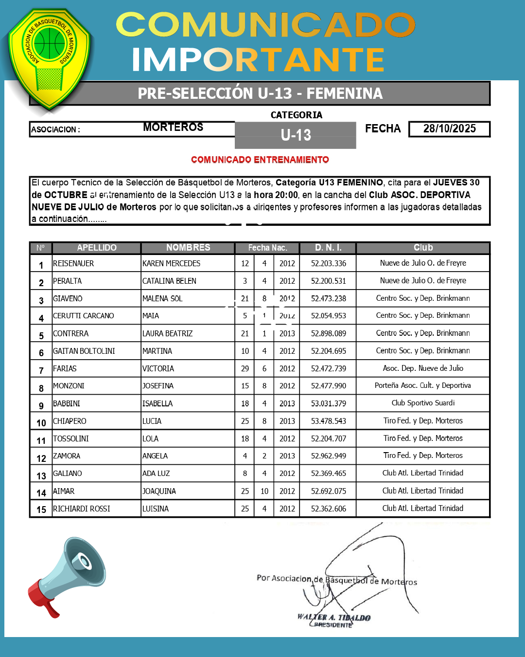 Octava Convocatoria a Entrenamientos Preselección U13 Femenina